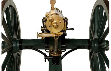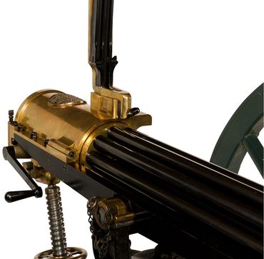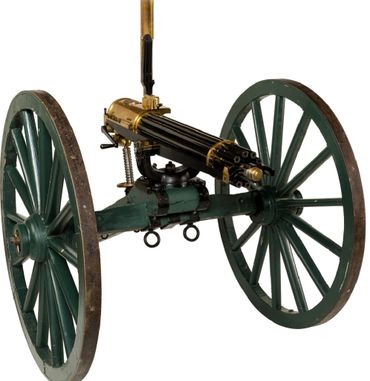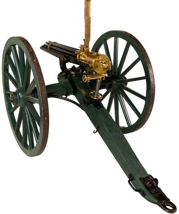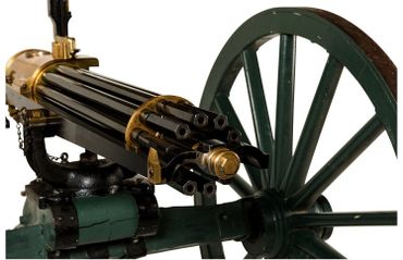 Condition: Fine as configured. Serial number 011 was restored to almost new condition approximately 20 years ago. Reportedly 3 barrels were replaced. It appears the Axel is original where as the tang and wheels are replacements. The hardware/furniture on the gun carriage appears to be original Gatling Gun carriage parts, with the wood being replaced. The wheels are complete reproductions. According to consignor and Gatling gun expert, Mr. Keller, "the gun is in shootable condition and shoots very well, both fast and accurately. If kept well oiled when firing, naming is minimal". Mr. Keller also states, "This gun has been fired with modern ammunition and has performed well. It is my opinion that only "cowboy" loads be fired from their gun. I have seen burst barrels on a couple of Gatling Guns and it is not a pretty sight. Original or reloaded cartridges loaded with black powder substitute is my recommendation. Ten-X out of California is a good source of this ammunition".