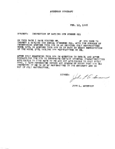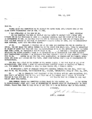 After seeing our replica guns, he had my dad inspect serial number 011 in detail to determine its status. It was determined, by complete disassembly, to be 100% of Anderson Guncraft manufacture and showed absolutely no signs of being in a fire. This individual was able to get his money back, and the dealer apparently consigned the gun to the Rock Island Auction Company and the gun was presumably sold to someone else.